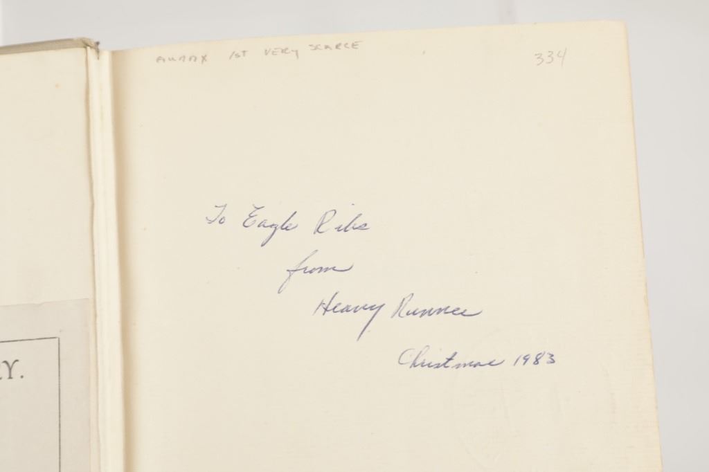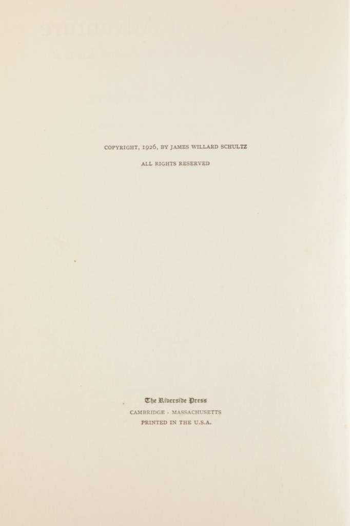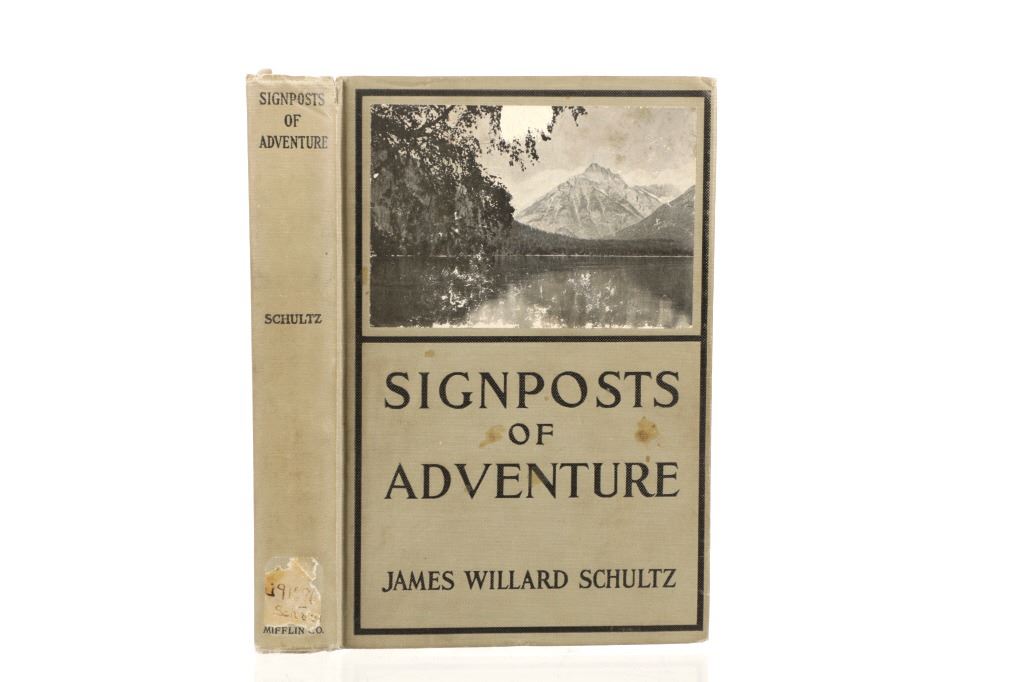 Presented in this lot is this 1926 First Edition of “Signposts of Adventure” by James Willard Schultz. “Signposts of Adventure Glacier National Park as the Indians Know It.", Houghton Mifflin Company publisher, The Riverside Press Cambridge, printers. 30 illustrations including photographs by Hileman, Kalispell, Montana. Folding map of Glacier National Park at the rear of the book. J. W. Schultz (1859–1947), or Apikuni, was an author, explorer, Glacier National Park guide, fur trader, and historian known for his historical writings of the Blackfoot Indians in the late 1800s, when he lived among them as a fur trader. He operated a fur trading post at Carroll, Montana and lived among the Pikuni tribe during the period 1880-82. He was given the name Apikuni by the Pikuni chief, Running Crane. Apikuni in Blackfeet means "Spotted Robe." In 1907, Schultz published "My Life as an Indian", the first of many future writings about the Blackfeet that he would produce over the next thirty years. Schultz is most noted for his 37 books, most about Blackfoot life, and for his contributions to the naming of prominent features in Glacier National Park. The book offered here is an authoritative guide to Glacier National Park by one who lived there and knew the Blackfeet intimately. A "must have" for any collector of James Willard Schultz, Blackfeet Indians, and/or Glacier National Park. The grey coloured clothbound hardcover is in nice condition, scuffing noted to edges, split observed at top of spine, library copy coding on lower spine. Intact pages exhibit age tanning. Measures 5.5"W x 8.25"L x 1"D, weight 1lb, 4oz approximate.