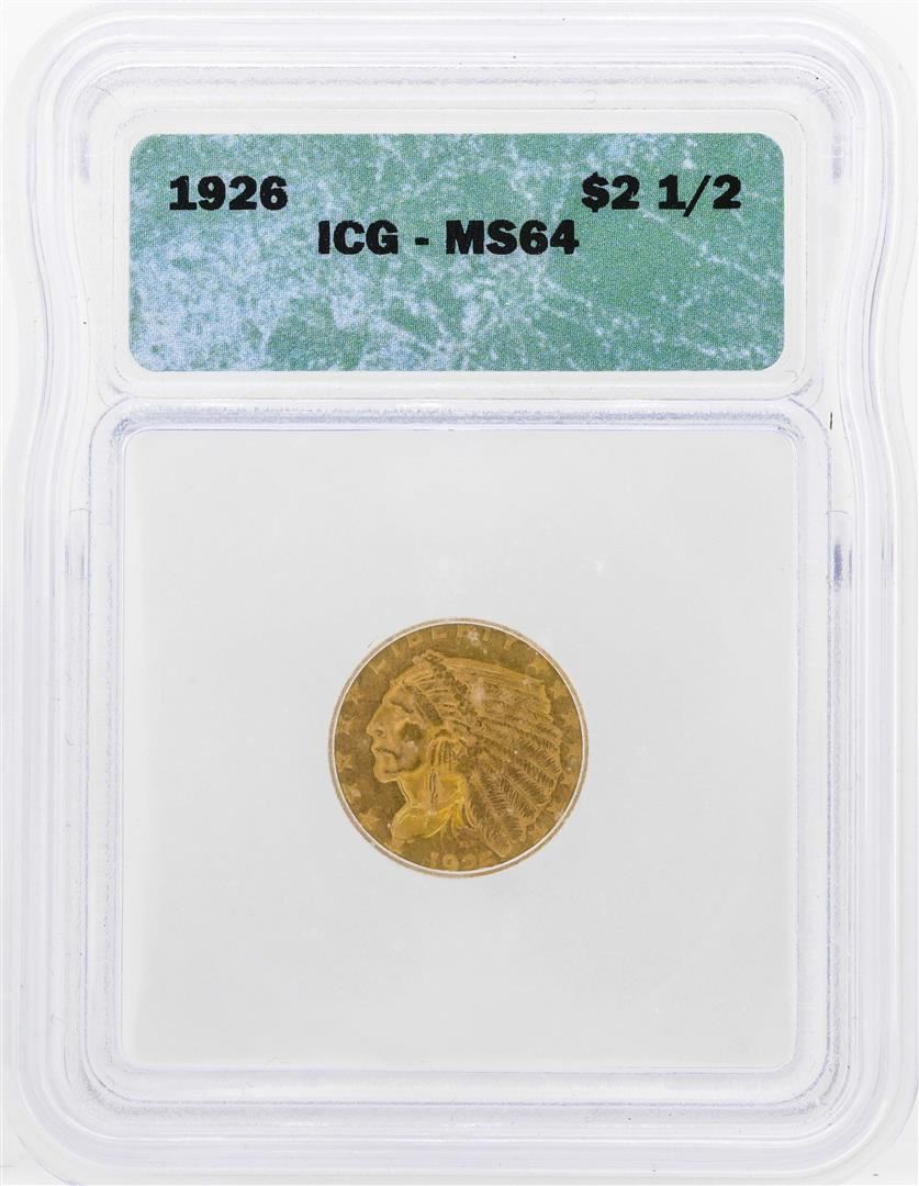 One 1926 $2 1/2 Indian Head Quarter Eagle Gold Coin ICG MS64. ICG Appraised.