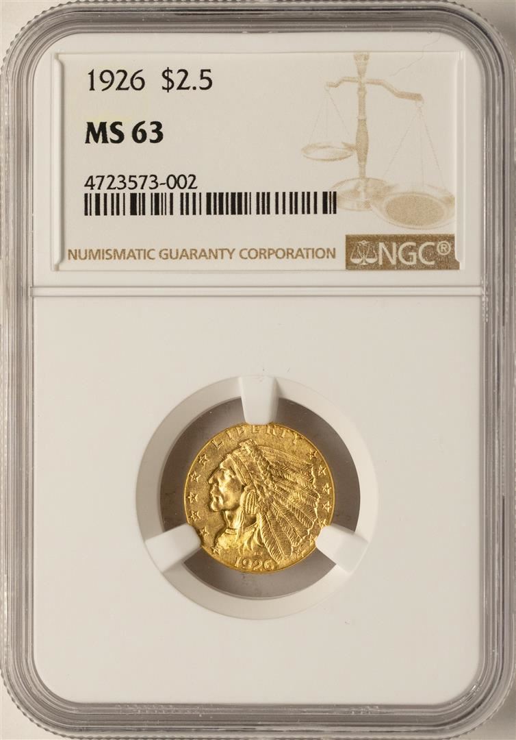 One 1926 $2 1/2 Indian Head Quarter Eagle Gold Coin NGC MS63. NGC Certified.