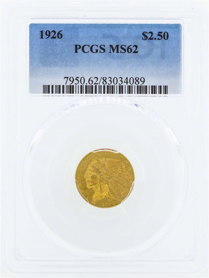 One 1926 $2 1/2 Indian Head Quarter Eagle Gold Coin PCGS MS62. PCGS Graded.
