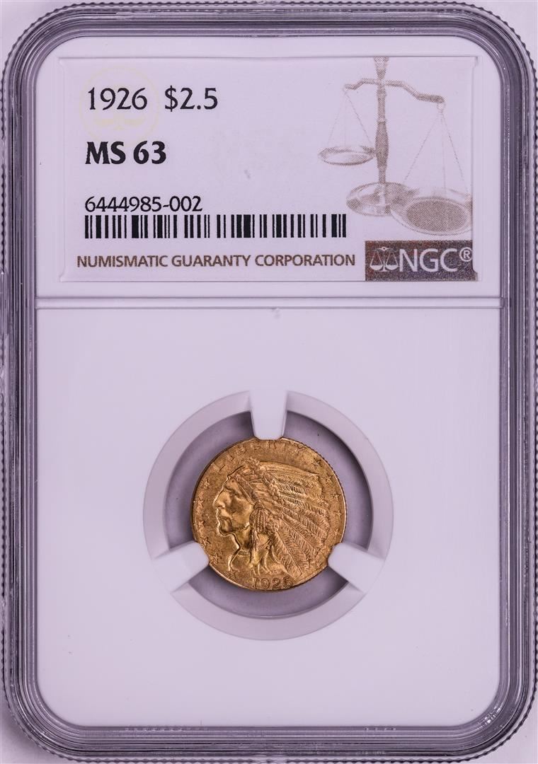 One 1926 $2 1/2 Indian Quarter Eagle Gold Coin NGC MS63. NGC Certified.