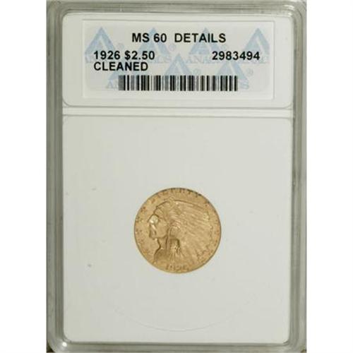 <B>1926 $2 1/2 --Cleaned--ANACS. MS60 Details.</B></I> NGC Census: (193/11636). PCGS Population (207/8268). Mintage: 446,000. Numismedia Wsl. Price for NGC/PCGS coin in MS60: $250. (#7950)<BR><BR><B>Coin Engraver:</B> Bela Lyon Pratt<BR><BR><b>Shipping:</b> Coins & Currency (<a target="_blank" href="http://www.heritageauctions.com/common/shipping.php">view shipping information</a>)