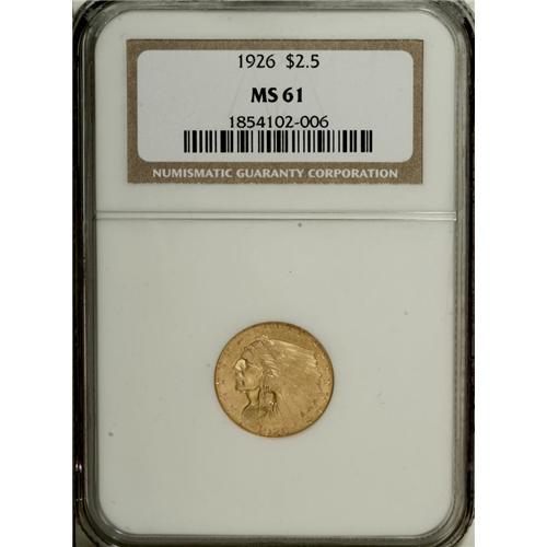 <B>1926 $2 1/2 MS61 NGC.</B></I> NGC Census: (1611/9769). PCGS Population (904/7193). Mintage: 446,000. Numismedia Wsl. Price for NGC/PCGS coin in MS61: $332. (#7950)<BR><BR><b>Shipping:</b> Coins & Currency (<a target="_blank" href="http://www.heritageauctions.com/common/shipping.php">view shipping information</a>)