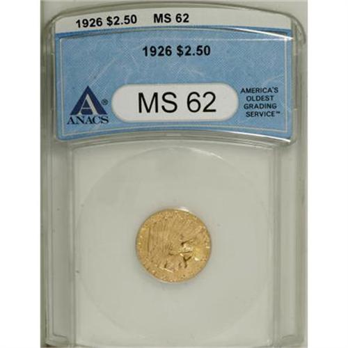 <B>1926 $2 1/2 MS62 ANACS.</B></I> NGC Census: (4004/6024). PCGS Population (2423/4948). Mintage: 446,000. Numismedia Wsl. Price for NGC/PCGS coin in MS62: $485. (#7950)<BR><BR><B>Coin Engraver:</B> Bela Lyon Pratt<BR><BR><b>Shipping:</b> Coins & Currency (<a target="_blank" href="http://www.heritageauctions.com/common/shipping.php">view shipping information</a>)
