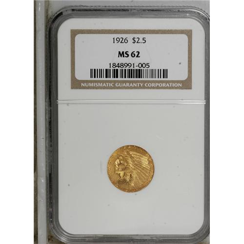 <B>1926 $2 1/2 MS62 NGC.</B></I> NGC Census: (3849/5825). PCGS Population (2370/4823). Mintage: 446,000. Numismedia Wsl. Price: $490. (#7950)<BR><BR><b>Shipping:</b> Coins & Currency (<a target="_blank" href="http://www.heritageauctions.com/common/shipping.php">view shipping information</a>)