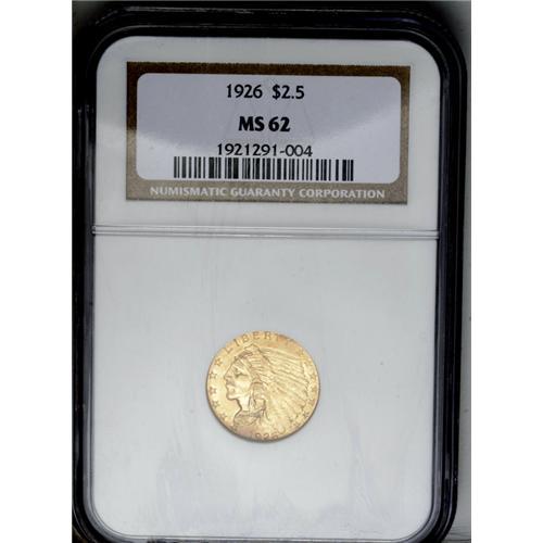 <B>1926<$2 1/2> MS62 NGC.</B></I> Satiny yellow-gold luster with a few minor scratches and other insignificant blemishes.