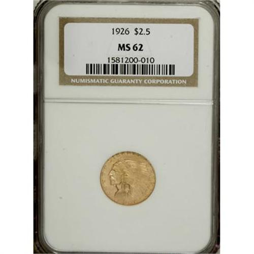 <B>1926 $2 1/2 MS62 NGC.</B></I> NGC Census: (4004/6024). PCGS Population (2445/5044). Mintage: 446,000. Numismedia Wsl. Price for NGC/PCGS coin in MS62: $485. (#7950)<BR><BR><B>Coin Engraver:</B> Bela Lyon Pratt<BR><BR><b>Shipping:</b> Coins & Currency (<a target="_blank" href="http://www.heritageauctions.com/common/shipping.php">view shipping information</a>)