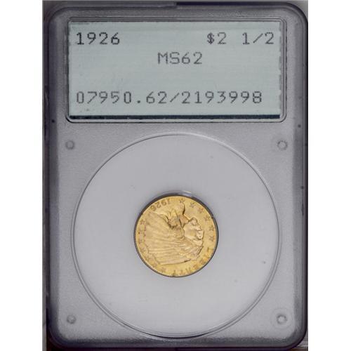 <B>1926<$2 1/2> MS62 PCGS.</B></I> The dusky apricot surfaces are less marked than is customary for the MS62 grade. Housed in a small-sized, early generation holder.