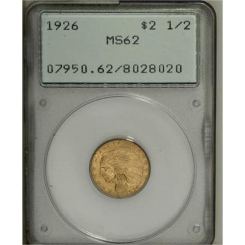<B>1926 $2 1/2 MS62 PCGS.</B></I> PCGS Population (2414/4909). NGC Census: (3986/5968). Mintage: 446,000. Numismedia Wsl. Price for NGC/PCGS coin in MS62: $445. (#7950)<BR><BR><B>Coin Engraver:</B> Bela Lyon Pratt<BR><BR><b>Shipping:</b> Coins & Currency (<a target="_blank" href="http://www.heritageauctions.com/common/shipping.php">view shipping information</a>\)