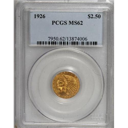 <B>1926 $2 1/2 MS62 PCGS.</B></I> PCGS Population (2432/4974). NGC Census: (4004/6024). Mintage: 446,000. Numismedia Wsl. Price for NGC/PCGS coin in MS62: $485. (#7950)<BR><BR><B>Coin Engraver:</B> Bela Lyon Pratt<BR><BR><b>Shipping:</b> Coins & Currency (<a target="_blank" href="http://www.heritageauctions.com/common/shipping.php">view shipping information</a>)