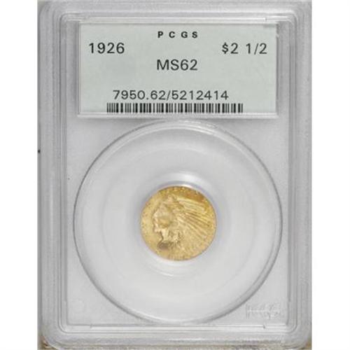 <B>1926 $2 1/2 MS62 PCGS.</B></I> PCGS Population (2470/5082). NGC Census: (4141/6169). Mintage: 446,000. Numismedia Wsl. Price for NGC/PCGS coin in MS62: $485. (#7950)<BR><BR><B>Coin Engraver:</B> Bela Lyon Pratt<BR><BR><b>Shipping:</b> Coins & Currency (<a target="_blank" href="http://www.heritageauctions.com/common/shipping.php">view shipping information</a>)