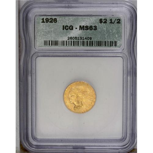 <B>1926<$2 1/2> MS63 ICG.</B></I> Well defined with rich pumpkin-orange surfaces and more subtle steel-blue accents. <BR><BR><B>Important notice:</B> Heritage usually auctions material at the rate of 200-250 lots per hour. On some occasions eBay Live bid software or the Internet may not be able to keep up with the pace of the auction. We recommend placing a realistic absentee bid now as insurance to avoid disappointment. Occasionally the auctioneer may eliminate or reject an eBay Live bid, and the auctioneer may also reopen a lot after the close of the eBay live bidding (usually because we missed an audience bid), and may reject your bid even if it shows you as the winning bidder. By bidding via eBay Live, you agree that Heritage may award the lot to another bidder at its sole discretion under the circumstances described above or any other reasonable circumstances. Since eBay bids are not shown to us until we open the lot on the floor, we treat those bids just like floor bids. In most cases the floor responds before the eBay bid is presented to us, due to Internet lag time, so for consistency we have made it a policy that floor bids are always considered first over tie eBay live bids. Also please note that all Heritage lots purchased through eBay Live carry a 20% Buyer's Premium. Please make sure you read the Terms and Conditions before you bid. This lot is being auctioned in conjunction with a live floor auction by Heritage Galleries & Auctioneers. All final auction and invoice information will be supplied by Heritage Galleries & Auctioneers, and all other information should be considered preliminary. Lot:2520 <BR><BR><B>Winning Notification and Billing:</B> After the FINAL session in this auction is complete, Heritage will send e-mail and snail mail invoices. This process normally takes several days. All final auction and invoice information will be supplied by Heritage Galleries & Auctioneers, and all other information should be considered preliminary. <BR><BR>This auction will be conducted on a live auction floor and over the Internet through eBay Live. If you choose to place an absentee bid, please take a moment to <font color='#0000ff'><u><a href='http://pages.ebay.com/liveauctions/help/before/laabsentee.html'>learn how eBay Live absentee bidding works</a></u></font><font color='#000000'>