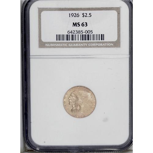 1926 $2 1/2 MS63 NGC. Peach-gold accents grace the sat