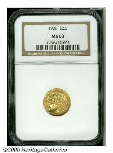 <B>1926<$2 1/2> MS63 NGC.</B></I> Very light yellow-gold example with attractive luster and just some typical light wispiness.