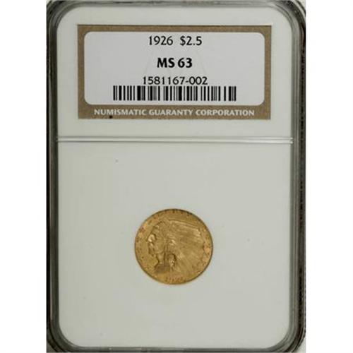 <B>1926 $2 1/2 MS63 NGC.</B></I> NGC Census: (3170/2854). PCGS Population (2405/2605). Mintage: 446,000. Numismedia Wsl. Price for NGC/PCGS coin in MS63: $825. (#7950)<BR><BR><B>Coin Engraver:</B> Bela Lyon Pratt<BR><BR><b>Shipping:</b> Coins & Currency (<a target="_blank" href="http://www.heritageauctions.com/common/shipping.php">view shipping information</a>)