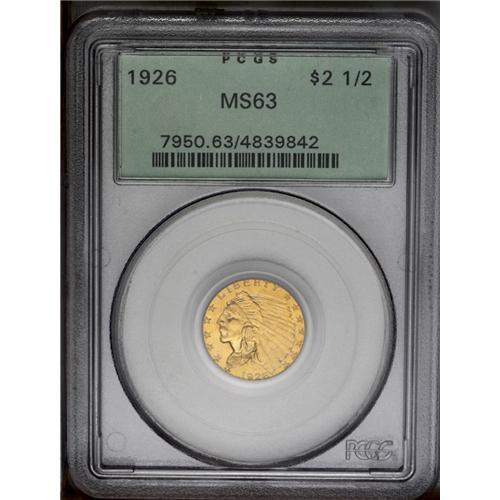 <B>1926<$2 1/2> MS63 PCGS.</B></I> A radiant lemon-gold type coin that gives the initial impression of a finer grade. Close scrutiny locates a faint field mark near the E in UNITED. Encased in a green label holder.