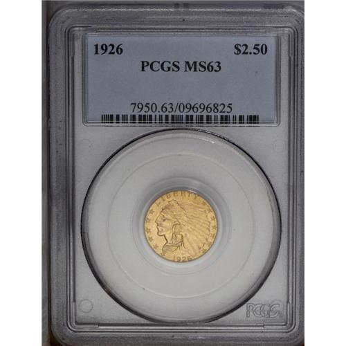 1926 $2 1/2 MS63 PCGS. Apricot-gold patina rests over 1926[$2 1/2] MS63 PCGS.