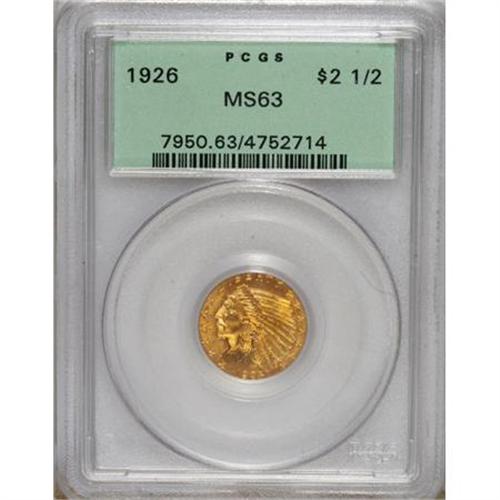 <B>1926 $2 1/2 MS63 PCGS.</B></I> Copper-red toning in the fields is contrasted against bright lime-gold devices. Lustrous and crisply struck, with minimal marks for the grade. Encapsulated in a green label PCGS holder, probably more than 15 years ago. <BR><BR><b>Shipping:</b> Coins & Currency (<a target="_blank" href="http://www.heritageauctions.com/common/shipping.php">view shipping information</a>)