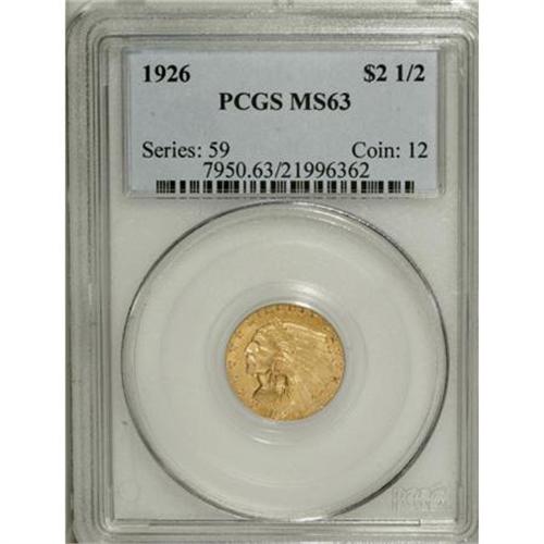 <B>1926 $2 1/2 MS63 PCGS.</B></I> A pleasing Mint State piece with excellent yellow-gold luster and frosty surfaces. This is a desirable piece with full design details. Faint reverse hairlines limit the grade.<BR><BR><b>Shipping:</b> Coins & Currency (<a target="_blank" href="http://www.heritageauctions.com/common/shipping.php">view shipping information</a>)