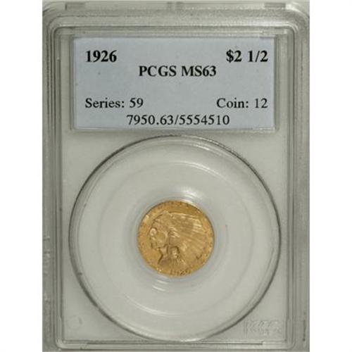 <B>1926 $2 1/2 MS63 PCGS.</B></I> PCGS Population (2376/2533). NGC Census: (3147/2821). Mintage: 446,000. Numismedia Wsl. Price for NGC/PCGS coin in MS63: $740. (#7950)<BR><BR><B>Coin Engraver:</B> Bela Lyon Pratt<BR><BR><b>Shipping:</b> Coins & Currency (<a target="_blank" href="http://www.heritageauctions.com/common/shipping.php">view shipping information</a>\)