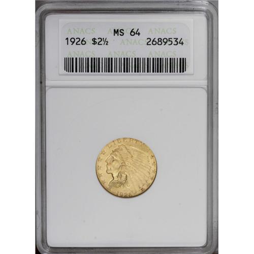 <B>1926<$2 1/2> MS64 ANACS.</B></I> A lovely and lustrous green-gold representative with attractive preservation despite a few faint rose alloy spots. Only the lowest headdress feathers lack an intricate strike.