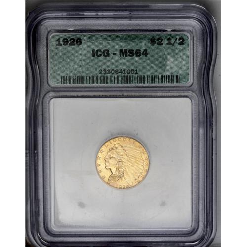 <B>1926<$2 1/2> MS64 ICG.</B></I> The 1926 is one of the favorite dates in the series for type collectors, as it is reasonably available in the upper Uncirculated grades, and is relatively well manufactured. This near-Gem example possesses attractive orange-gold color, with subtle lime-green accents that are most apparent on the obverse. The design elements are powerfully struck, further enhancing the coin's eye appeal. Some shallow linear marks on the reverse are mentioned for accuracy.