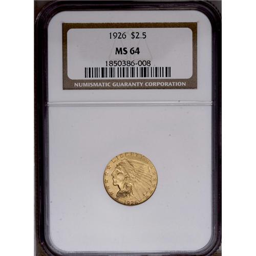 <B>1926<$2 1/2> MS64 NGC.</B></I> A highly lustrous apricot-tinged Choice gold type coin with a particularly pleasing obverse. The strike is suitable, and the eye appeal is impressive for the designated grade.