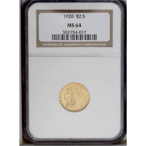 <B>1926<$2 1/2> MS64 NGC.</B></I> A satiny and carefully preserved khaki-gold type coin that features above average sharpness on the headdress feathers.
