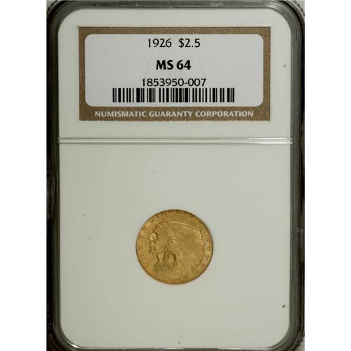 <B>1926 $2 1/2 MS64 NGC.</B></I> A satiny and well struck orange-gold near-Gem. The overall eye appeal is strong, though a few light grazes and ticks on the obverse restrict the grade.<BR><BR><b>Shipping:</b> Coins & Currency (<a target="_blank" href="http://www.heritageauctions.com/common/shipping.php">view shipping information</a>)