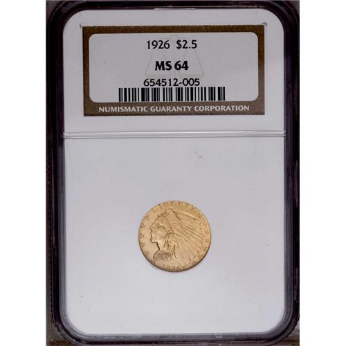 <B>1926<$2 1/2> MS64 NGC.</B></I> Boldly struck with satiny luster, pleasing pastel rose and mint-green toning, and a few wispy marks on the reverse. An attractive near-Gem example of this Indian quarter eagle issue.