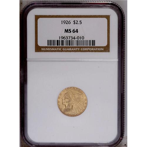 <B>1926<$2 1/2> MS64 NGC.</B></I> Bright yellow-gold surfaces that are quite frosty and present very nicely without getting into the more expensive Gem Mint State categories.