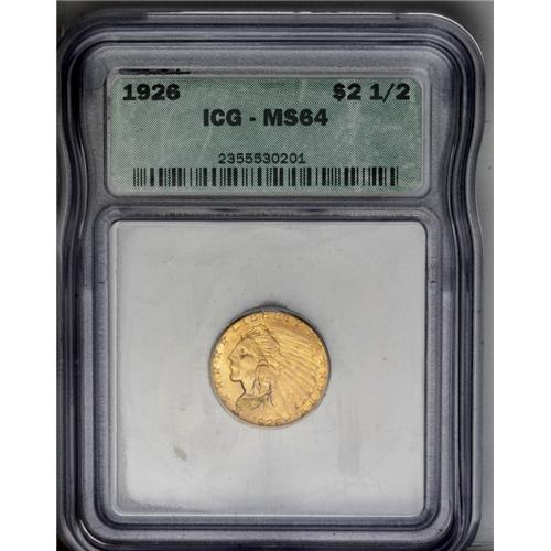 <B>1926<$2 1/2> MS64 ICG.</B></I> Rich honey-gold color over frosty surfaces. This is a splendid example with full luster on both sides. Wispy blue toning can be seen on the reverse.