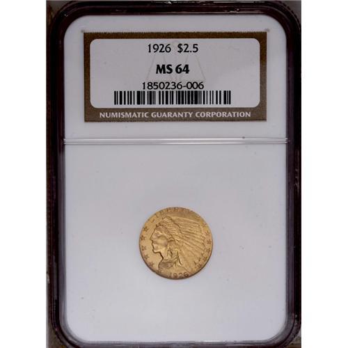 <B>1926<$2 1/2> MS64 NGC.</B></I> Soft luster radiates from the satiny straw-gold surfaces, and few abrasions are seen, even under a loupe, except for a single tick on the Indian's cheek and some minor, undistracting light marks in the reverse field.