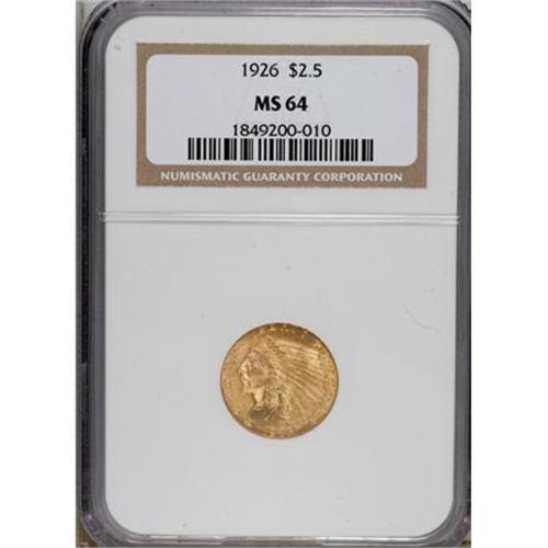 <B>1926 $2 1/2 MS64 NGC.</B></I> A well struck Choice example that displays subtle luster and minor marks on the yellow-orange surfaces. Subtle violet accents appear in the hollows of this Roaring Twenties piece.<BR><BR><b>Shipping:</b> Coins & Currency (<a target="_blank" href="http://www.heritageauctions.com/common/shipping.php">view shipping information</a>)