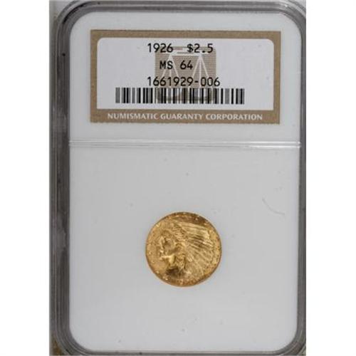 <B>1926 $2 1/2 MS64 NGC.</B></I> Pleasing detail and shining straw-gold surfaces enhance the visual appeal of this appealingly preserved Choice quarter eagle. A lovely example from the first Philadelphia issue of the denomination since 1915.<BR><BR><B>Coin Engraver:</B> Bela Lyon Pratt<BR><BR><b>Shipping:</b> Coins & Currency (<a target="_blank" href="http://www.heritageauctions.com/common/shipping.php">view shipping information</a>)