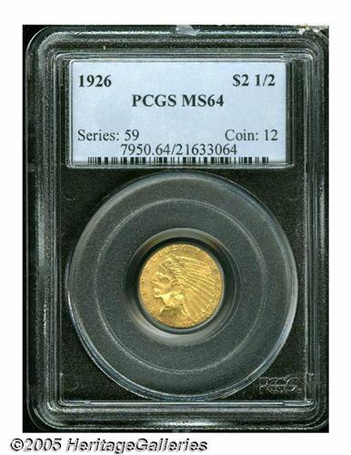 <B>1926<$2 1/2> MS64 PCGS.</B></I> Honey-gold toning is accented by pale-green color in some of the recessed areas, particularly on the obverse. The design elements are generally well struck. Several small marks in the reverse fields limit the grade.