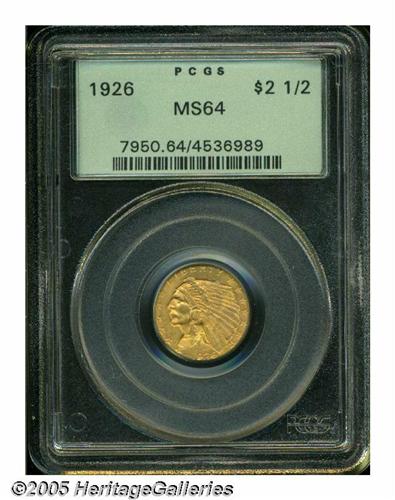<B>1926<$2 1/2> MS64 PCGS.</B></I> Rich olive and peach patina graces this nicely struck and well preserved older holder near-Gem. Not a rare date, but certainly a splendid addition to an advanced gold type set.