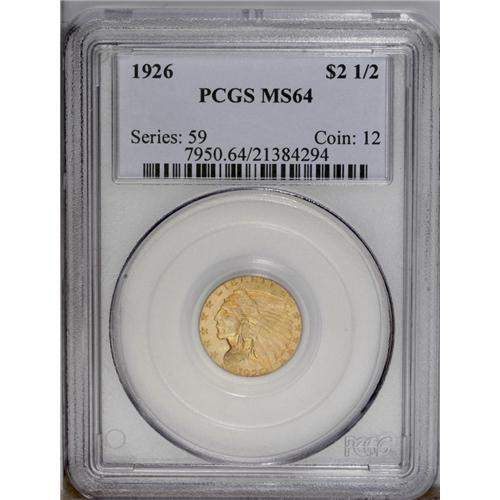 <B>1926<$2 1/2> MS64 PCGS.</B></I> Stunningly presented, with only light evidence of contact, bold design details, and sky-blue patination. <BR><BR><B>Important notice:</B> Heritage usually auctions material at the rate of 200-250 lots per hour. On some occasions eBay Live bid software or the Internet may not be able to keep up with the pace of the auction. We recommend placing a realistic absentee bid now as insurance to avoid disappointment. Occasionally the auctioneer may eliminate or reject an eBay Live bid, and the auctioneer may also reopen a lot after the close of the eBay live bidding (usually because we missed an audience bid), and may reject your bid even if it shows you as the winning bidder. By bidding via eBay Live, you agree that Heritage may award the lot to another bidder at its sole discretion under the circumstances described above or any other reasonable circumstances. Since eBay bids are not shown to us until we open the lot on the floor, we treat those bids just like floor bids. In most cases the floor responds before the eBay bid is presented to us, due to Internet lag time, so for consistency we have made it a policy that floor bids are always considered first over tie eBay live bids. Also please note that all Heritage lots purchased through eBay Live carry a 20% Buyer's Premium. Please make sure you read the Terms and Conditions before you bid. This lot is being auctioned in conjunction with a live floor auction by Heritage Galleries & Auctioneers. All final auction and invoice information will be supplied by Heritage Galleries & Auctioneers, and all other information should be considered preliminary. Lot:2522 <BR><BR><B>Winning Notification and Billing:</B> After the FINAL session in this auction is complete, Heritage will send e-mail and snail mail invoices. This process normally takes several days. All final auction and invoice information will be supplied by Heritage Galleries & Auctioneers, and all other information should be considered preliminary. <BR><BR>This auction will be conducted on a live auction floor and over the Internet through eBay Live. If you choose to place an absentee bid, please take a moment to <font color='#0000ff'><u><a href='http://pages.ebay.com/liveauctions/help/before/laabsentee.html'>learn how eBay Live absentee bidding works</a></u></font><font color='#000000'>
