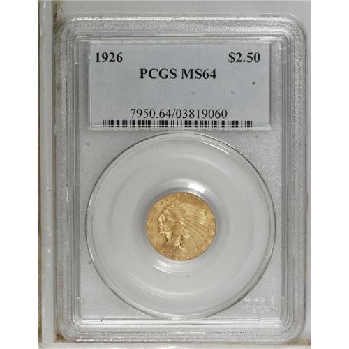<B>1926 $2 1/2 MS64 PCGS.</B></I> This issue is usually seen in grades around MS62, but MS64 and higher pieces are available for a price. This specimen boasts typically frosty, mattelike surfaces with good color and a few light, grade-consistent ticks.<BR><BR><b>Shipping:</b> Coins & Currency (<a target="_blank" href="http://www.heritageauctions.com/common/shipping.php">view shipping information</a>)