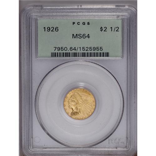 <B>1926<$2 1/2> MS64 PCGS.</B></I> This luminous straw-gold representative is highly lustrous and boldly struck, with sparkling surfaces that display a few small, yet grade-limiting contact marks. A visually pleasing near-Gem example. Housed in a green label holder.