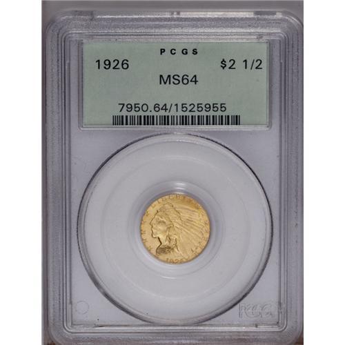 <B>1926 $2 1/2 MS64 PCGS.</B></I> This luminous straw-gold representative is highly lustrous and boldly struck, with sparkling surfaces that display a few small, yet grade-limiting contact marks. A visually pleasing near-Gem example. Housed in a green label holder.