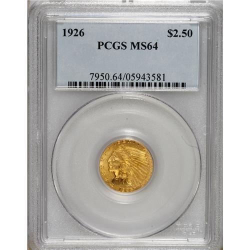 <B>1926 $2 1/2 MS64 PCGS.</B></I> Vibrant luster and rich lime-gold coloration are the chief attributes of this near-Gem. A spidery die crack extends through the leftmost leaves on the lower reverse. A nick on the Indian's jaw is the only minor detraction on either side of the coin.<BR><BR><b>Shipping:</b> Coins & Currency (<a target="_blank" href="http://www.heritageauctions.com/common/shipping.php">view shipping information</a>)
