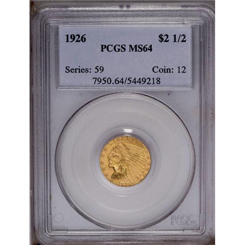 1926 $2 1/2 MS64 PCGS. Well struck and lustrous, with 1926[$2 1/2] MS64 PCGS.