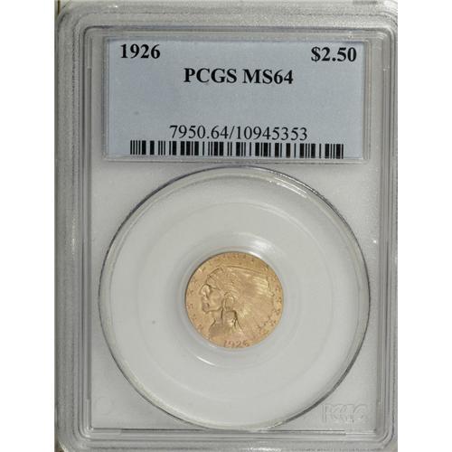 <B>1926 $2 1/2 MS64 PCGS.</B></I> Well struck and rather frosty with traces of jade alongside the butter-yellow of the surfaces. Light marks are noted in the left obverse and right reverse fields.<BR><BR><b>Shipping:</b> Coin/Currency (<a target="_blank" href="http://www.heritageauctions.com/common/shipping.php">view shipping information</a>)