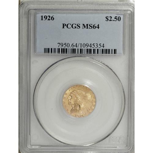 <B>1926 $2 1/2 MS64 PCGS.</B></I> Yellow-gold with a touch of emerald on each side. The luster is pretty and the strike is above-average, though a few too many marks are present for this to be a Gem.<BR><BR><b>Shipping:</b> Coin/Currency (<a target="_blank" href="http://www.heritageauctions.com/common/shipping.php">view shipping information</a>)