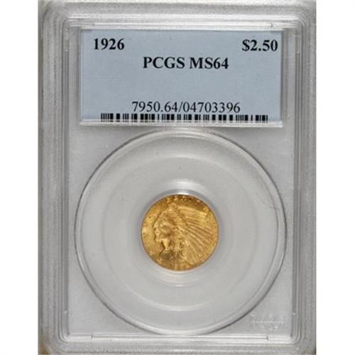 <B>1926 $2 1/2 MS64 PCGS.</B></I> A slightly frosty representative of this late-date quarter eagle, lemon-gold on the obverse with an orange-gold reverse. Well-defined overall with just a few too many marks to qualify for a Gem grade.<BR><BR><b>Shipping:</b> Coins & Currency (<a target="_blank" href="http://www.heritageauctions.com/common/shipping.php">view shipping information</a>)