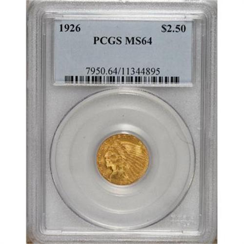 <B>1926 $2 1/2 MS64 PCGS.</B></I> An attractive example of this Roaring Twenties issue, well-defined overall with satiny yellow-orange surfaces. The obverse is largely mark-free, though a few wispy marks are noted to the right of the eagle's head.<BR><BR><b>Shipping:</b> Coins & Currency (<a target="_blank" href="http://www.heritageauctions.com/common/shipping.php">view shipping information</a>)