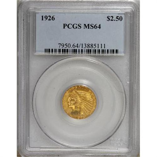 <B>1926 $2 1/2 MS64 PCGS.</B></I> PCGS Population (1942/542). NGC Census: (2424/375). Mintage: 446,000. Numismedia Wsl. Price for NGC/PCGS coin in MS64: $1,160. (#7950)<BR><BR><B>Coin Engraver:</B> Bela Lyon Pratt<BR><BR><b>Shipping:</b> Coins & Currency (<a target="_blank" href="http://www.heritageauctions.com/common/shipping.php">view shipping information</a>\)