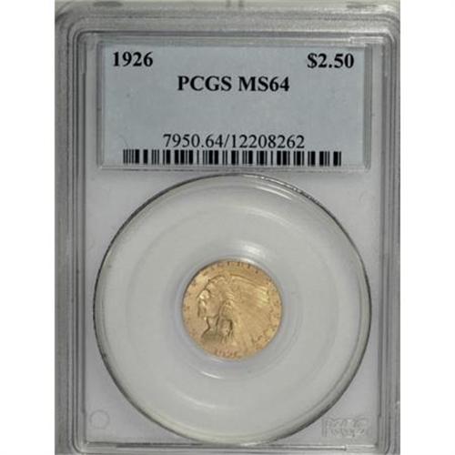 <B>1926 $2 1/2 MS64 PCGS.</B></I> Satiny and well struck, with shimmering luster and pale greenish honey-gold toning across both sides. A small blemish is evident just to the right of obverse star 4, and a few paper-thin marks are evident, under low magnification, on the reverse fields. <BR><BR><B>Coin Engraver:</B> Bela Lyon Pratt<BR><BR><b>Shipping:</b> Coins & Currency (<a target="_blank" href="http://www.heritageauctions.com/common/shipping.php">view shipping information</a>)