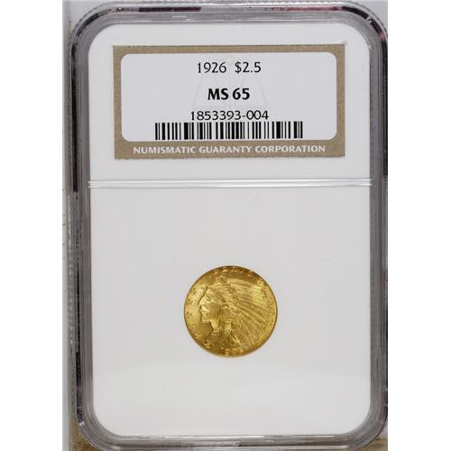 <B>1926 $2 1/2 MS65 NGC.</B></I> The 1926-P is one of the better-produced issues in the Indian head quarter eagle series. The design elements are well delineated throughout, and lustrous yellow-gold surfaces exhibit traces of light tan. Close examination reveals just a few minor handling marks. This is a solid Gem with nice overall eye appeal. NGC has graded only 11 pieces finer (11/06).<BR><BR><b>Shipping:</b> Coin/Currency (<a target="_blank" href="http://www.heritageauctions.com/common/shipping.php">view shipping information</a>)